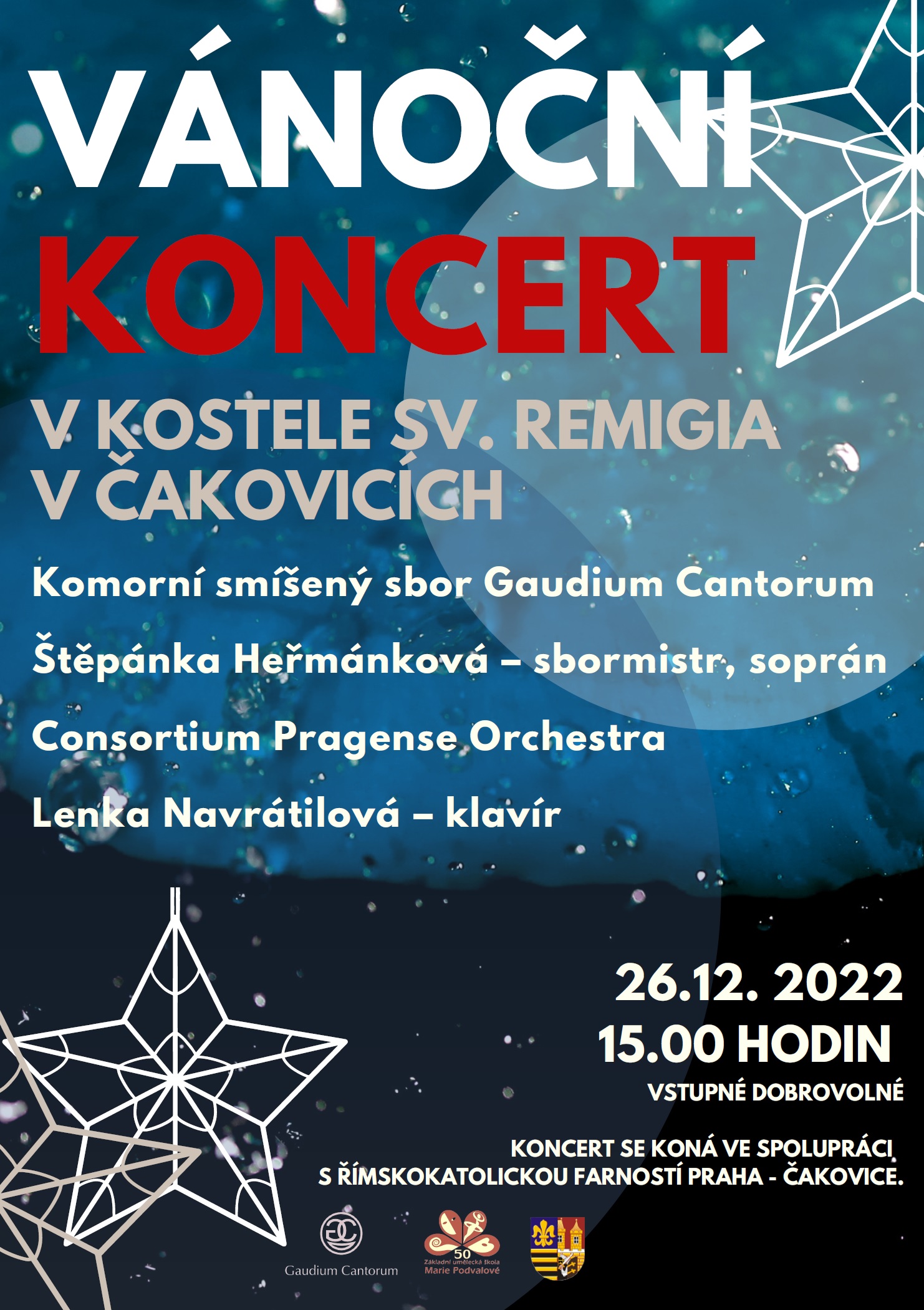 Praha-Čakovice, kostel sv. Remigia26. 12. 2022 v 15:00komorní smíšený sbor Gaudium CantorumConsortium Pragense OrchestraŠtěpánka Heřmánková - sopránLenka Navrátilová - klavír