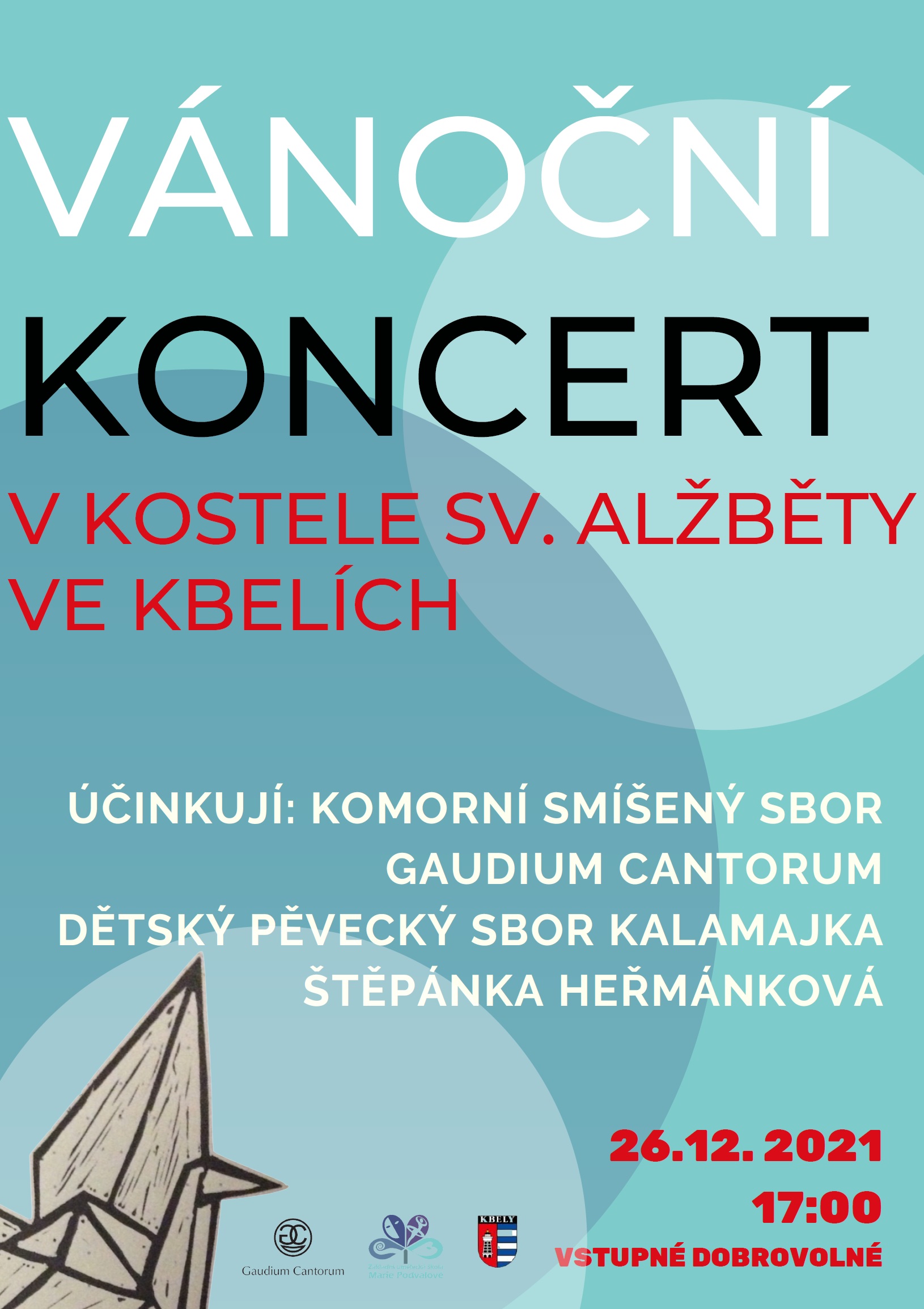 Kbely - kostel sv. Alžběty26. 12. 2021 v 17:00komorní smíšený sbor Gaudium CantorumŠtěpánka Heřmánková - soprándětský pěvecký sbor KALAMAJKA
